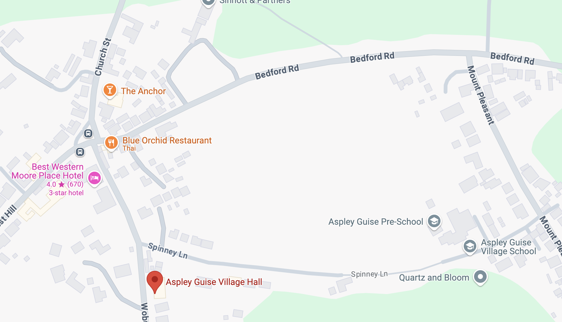 This meeting will be held in the Aspley Guise Village Hall, in the Committee Room. The Hall has its own car parking and offers free wifi. The car park is reached via Spinney Lane (note that Spinney Lane is not open to motor traffic from Mount Pleasant). Click the map to jump to Google Maps.